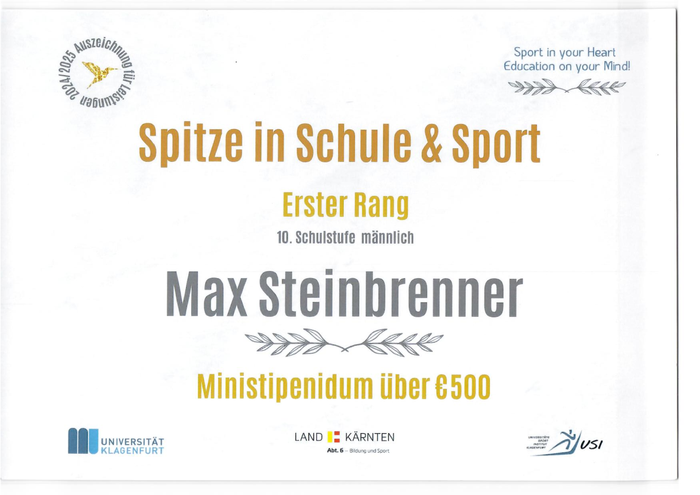 Kanusportler Max Steinbrenner von der Sportunion Klagenfurt gelang es durch seine sportlichen Ergebnisse 2025 und seiner schulischen Ergebnisse 2024/25 auf der HAK1 in der Jahrgangsstufe 10 einen TOP-Platz zu erreichen. Er freute sich natürlich über das erlangte Mini-Stipendium und die Repräsentationsmöglichkeit des Kanu-Slalom-Sports bei der Prämierungsfeier an der Alpen-Adria-Universität.